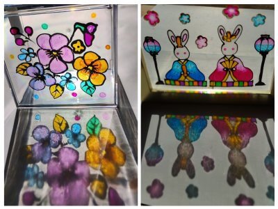 「ディンプルアート体験」 ◇車のリサイクルから生まれた絵の具で塗り絵の様に塗るだけでステンドグラスのようなアートに。 |