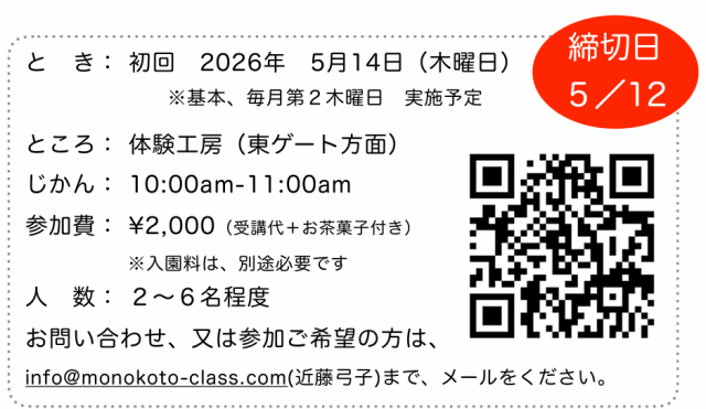 2026年5月14日 イベント 体験・教室 【予約制】お花で英会話 開催期間 2026年5月14日 10:00~12:00 「植物に関すること」をテーマに 初心者の方でも気軽に楽しめる完結な内容の英会話教室です。 レッスン終了後は、お話をしながら園内の見所をご紹介します! *予約制となりますので、下記メールアドレスへご連絡をお願いします。 ●会場 : 体験工房(最寄り 東ゲート)