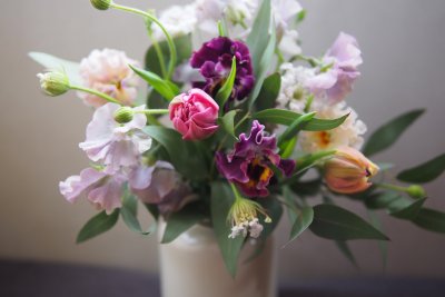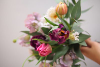 パンジーの切り花や季節のお花、グリーンなどを使って、春を感じるミニブーケを作成します。